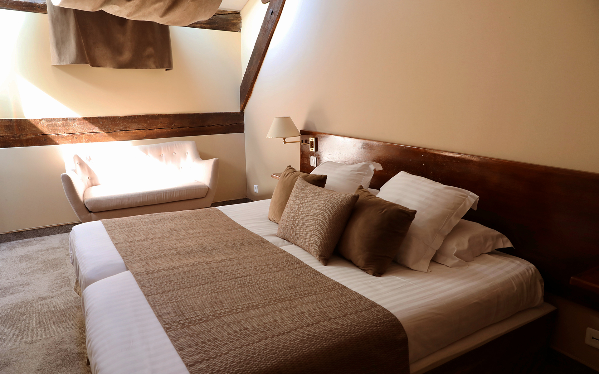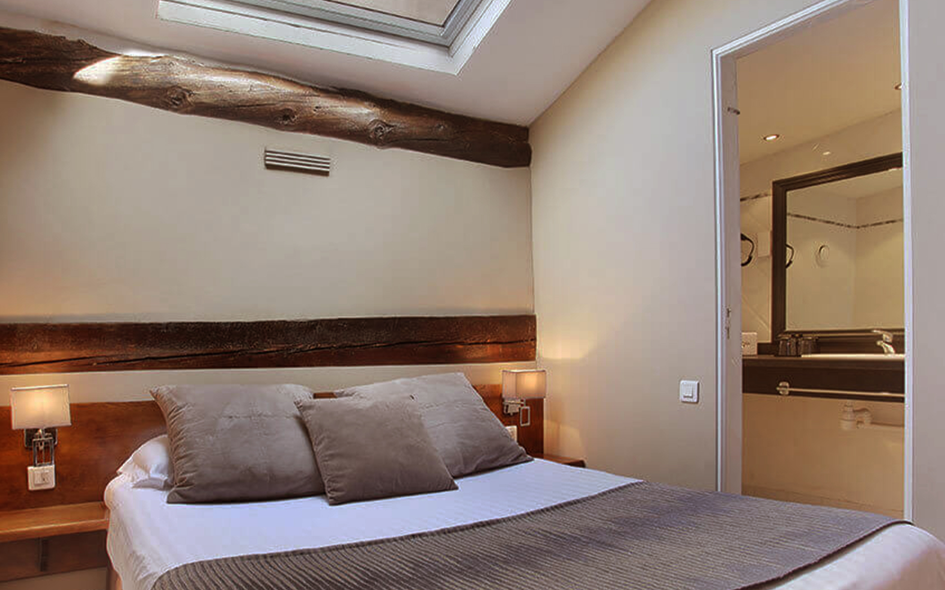 L’hôtel dispose de 2 chambres de charme sous les toits avec Velux de 16 et 21 m2. Ces chambres sont accessibles par un petit escalier et disposent de mini bar, baignoires, sèches cheveux, produits d’accueil.